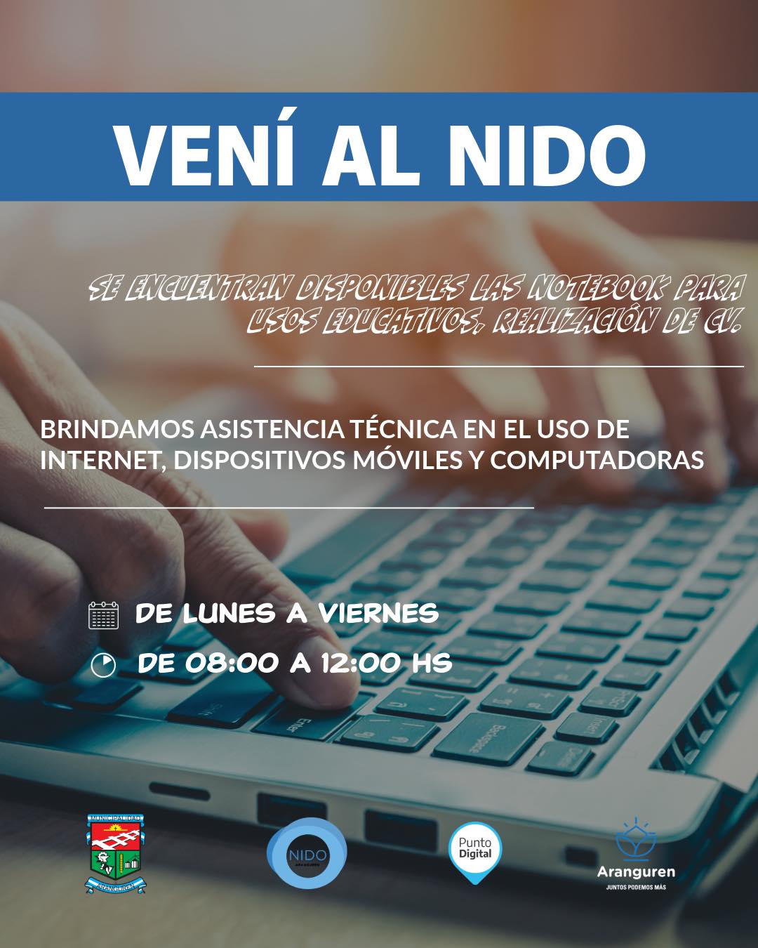 Se encuentran disponibles además las notebooks para uso educativo y la realización de CV. Se brinda asistencia técnica en el uso de Internet, dispositivos móviles y computadoras, en este caso de lunes a viernes de 8:00 a 12:30.