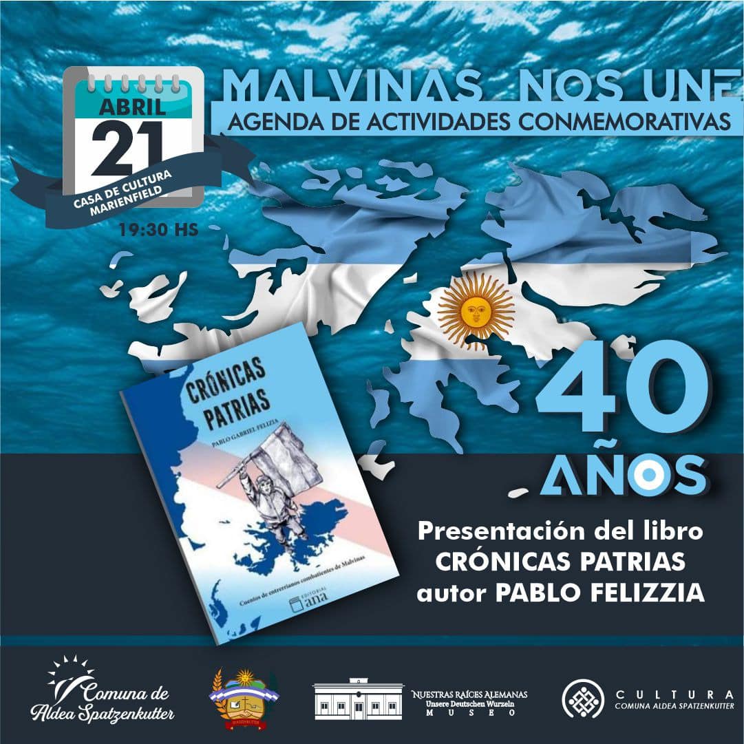 El jueves 21 de Abril a las 19.30 Spatzenkutter tendrá la visita del Licenciado Pablo Felizia, quien viene a presentar su libro «Crónicas patrias». Este evento se enmarca en la agenda de actividades conmemorativas por el 40⁰ Aniversario de la Guerra de Malvinas que se propuso desde el Área de Cultura de la Comuna.