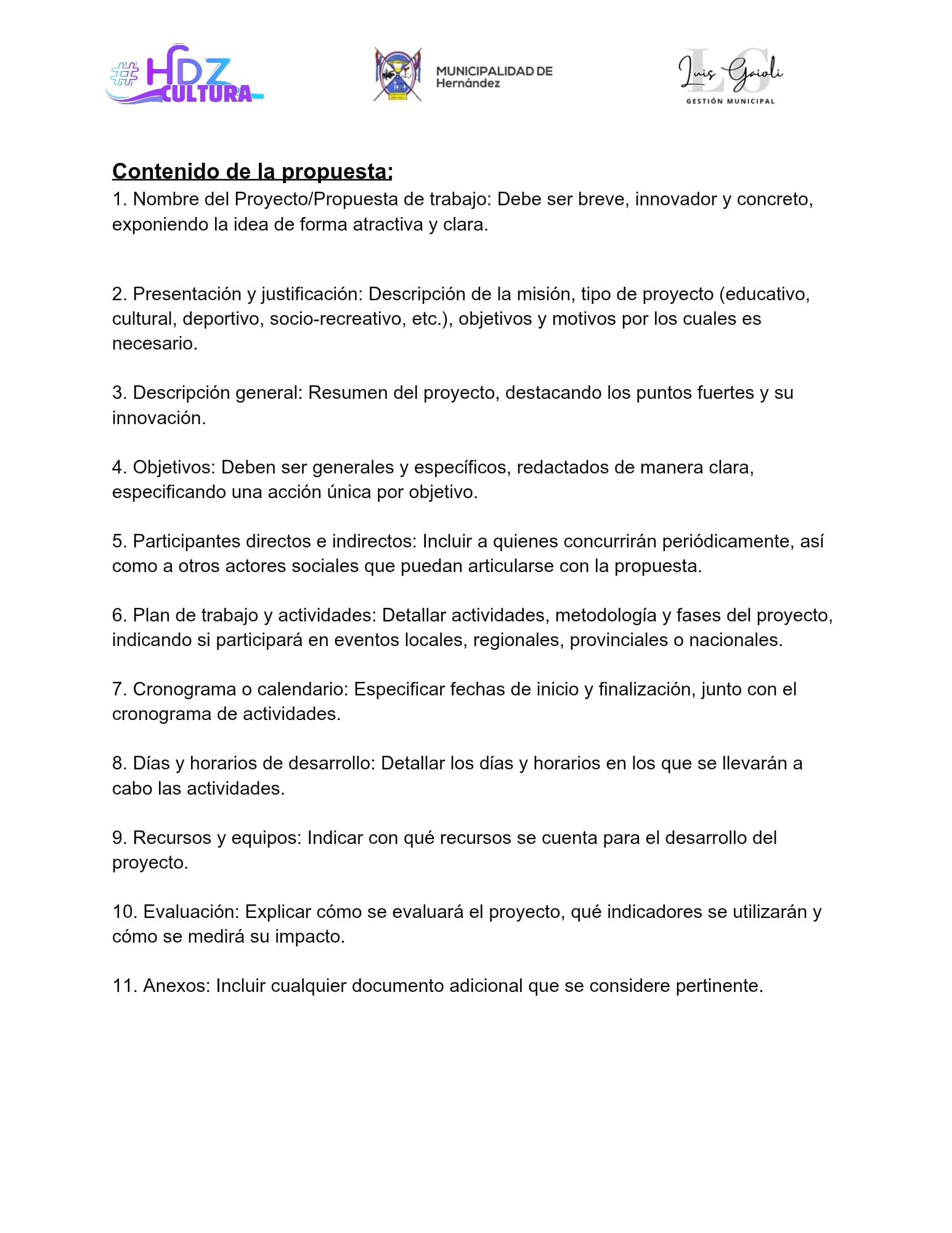 La propuesta debe acercarse en sobre cerrado, con currículum abreviado y una presentación general que no exceda las 5 páginas, en formato impreso, Fuente Arial 12, Interlineado de 1,5 líneas y texto justificado, hasta el viernes 28 de febrero en el edificio municipal, de lunes a viernes de 9.00 a 12.00.