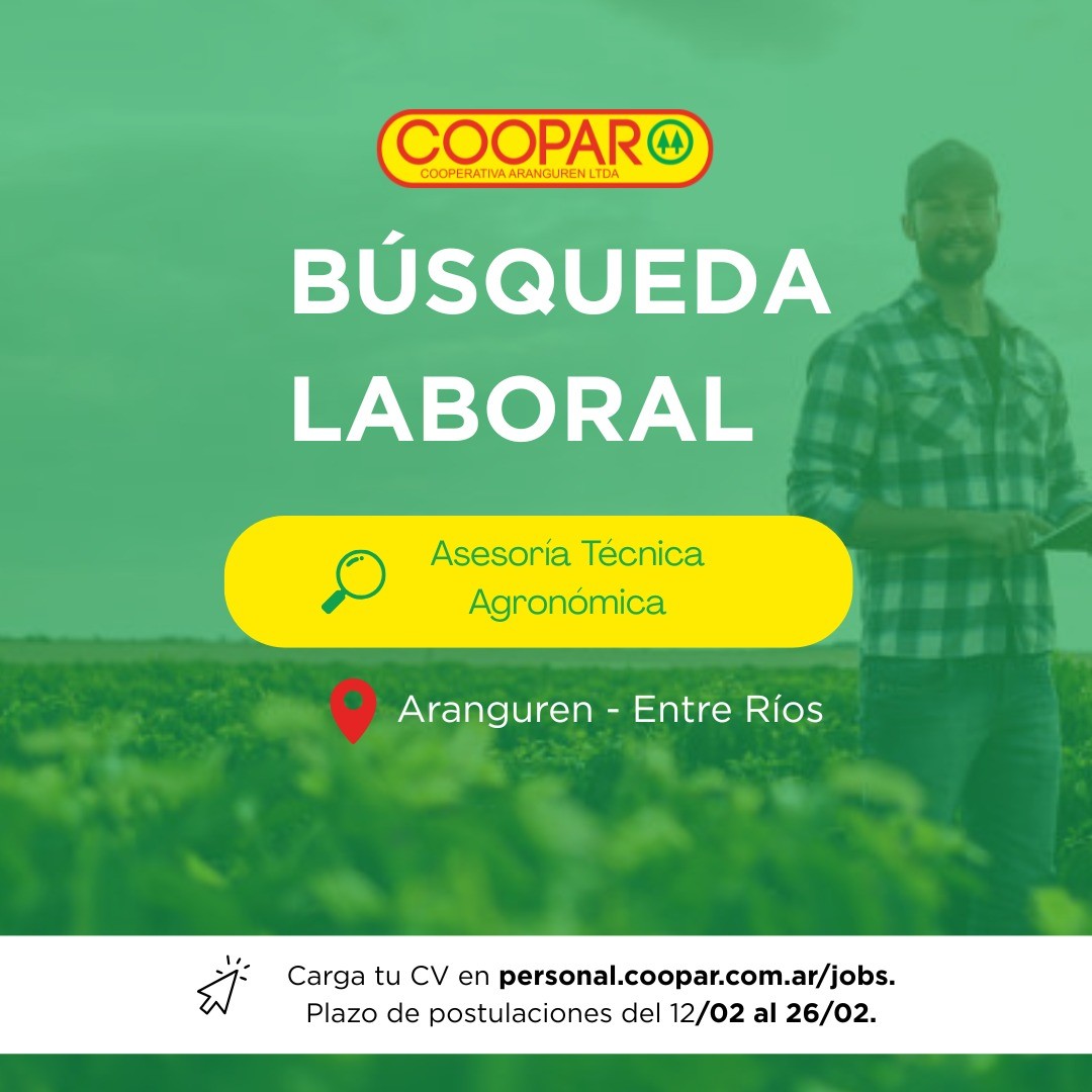 La Cooperativa Agrícola Ganadera y de Servicios Públicos Aranguren Ltda. (COOPAR) informa que se encuentra abierta la convocatoria para incorporar un/a profesional al área de Asesoría Técnica Agronómica, con sede en Aranguren, Entre Ríos.