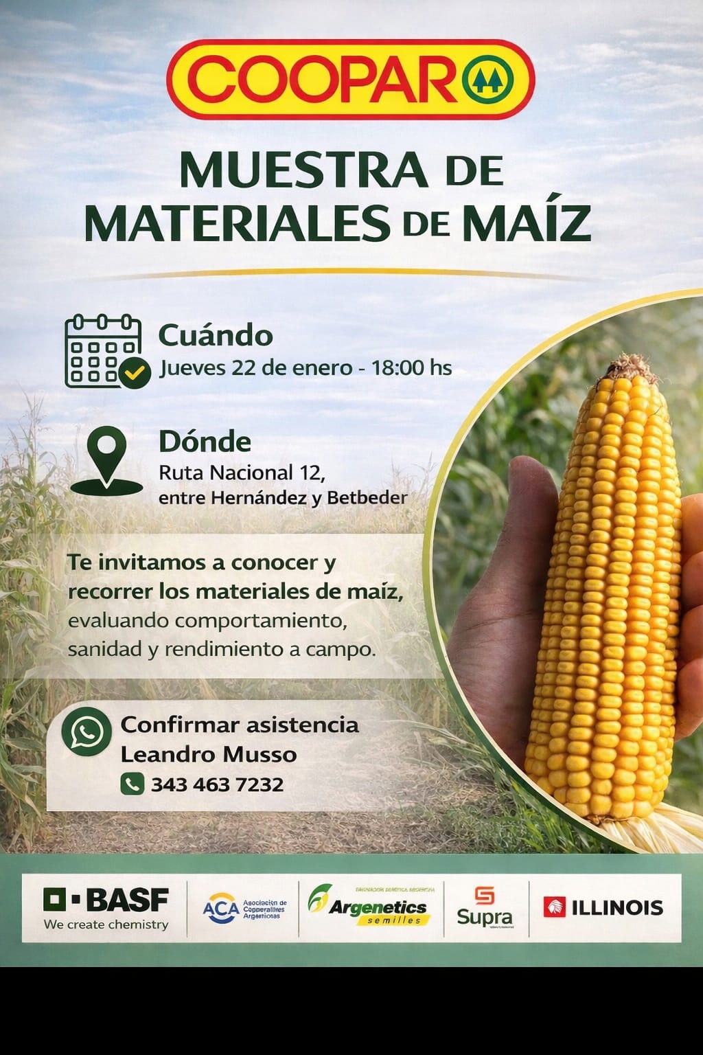 La Cooperativa Agrícola Ganadera y de Servicios Públicos Aranguren Ltda. (COOPAR) invita a productores de la región a participar de una muestra a campo de híbridos de maíz, en el marco de la Campaña 2025/2026.