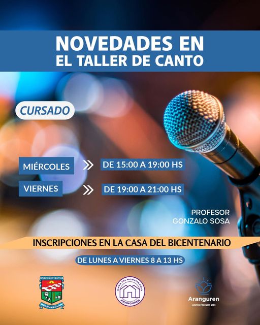 Hay novedades en el taller de canto. Se ofrece el taller los miércoles de 15:00 a 19:00 y los viernes de 19:00 a 21:00, estando a cargo del Profesor Gonzalo Sosa. Se pueden seguir inscribiendo en la Casa del Bicentenario de 8:00 a 13:00.