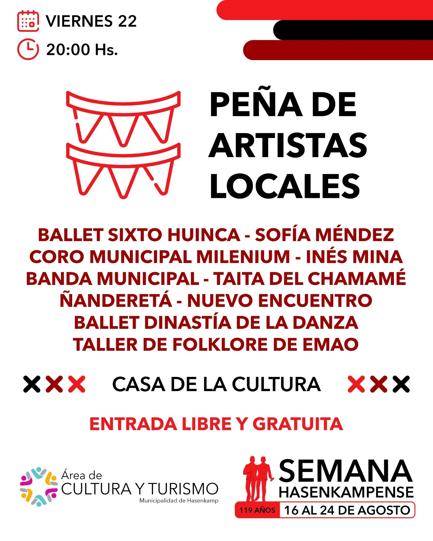 Hoy, durante todo el día, habrá una muestra de arte en la explanada de la Escuela Municipal de Artes y Oficios y clase abierta de distintos tipos de tejidos frente al Centro Cívico. A la noche se desarrolla la Peña de los artistas locales en la Casa de la Cultura, con entrada libre y gratuita.
