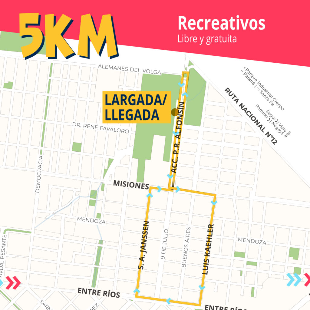 A las 18:00 se largará una nueva edición de la maratón, con los 10 kilómetros Competitivos (con inscripción) que tendrá un total de $2.000.000 en premios, más remeras, trofeos y medallas finish; y los 5 km Aeróbicos y Caminata Familiar (gratuita). Habrá dos circuitos, atravesando diferentes calles y barrios de la ciudad de Crespo.