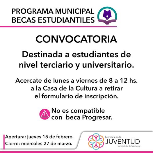 Este año el formulario se retira de la Casa de la Cultura de lunes a viernes de 8.00 a 12.00, siendo el plazo máximo el miércoles 27 de marzo y sin ser compatible con la Beca Progresar.