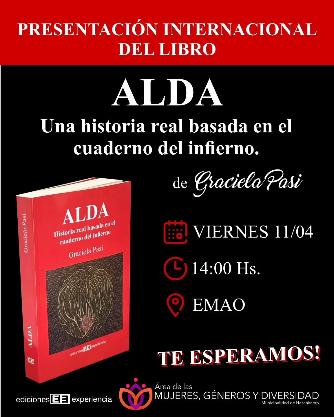 El viernes 11 de abril, a las 14:00 horas, en la Escuela Municipal de Artes y Oficios de Hasenkamp, Graciela Pasi presentará, su última novela “ALDA”, una obra inspirada en la historia real del «cuaderno del infierno».