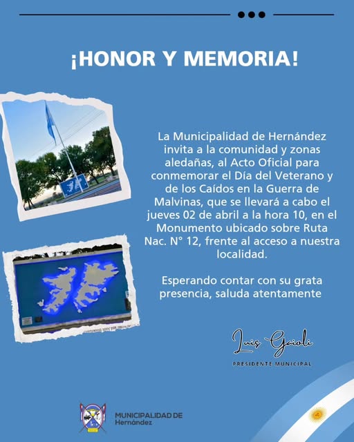 La Municipalidad de Hernández invita a toda la comunidad y zonas aledañas a participar del Acto Oficial en conmemoración del Día del Veterano y de los Caídos en la Guerra de Malvinas.