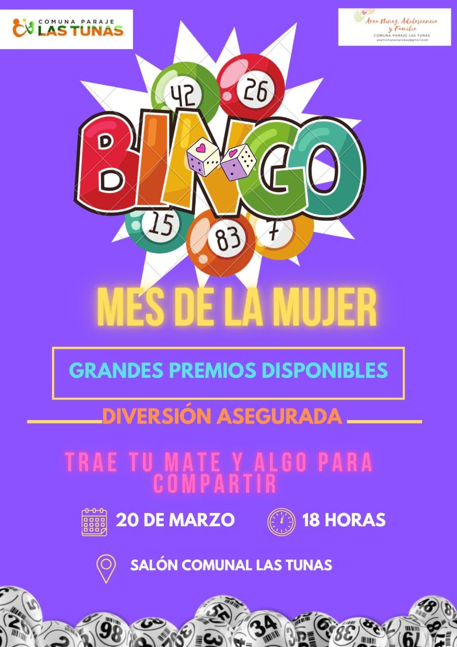 Este 20 de marzo a partir de las 18.00 en el Salón Comunal se programa un bingo, con grandes premios disponibles y diversión asegurada. Se invita a las participantes a traer el mate y algo para compartir en esta jornada de camaradería