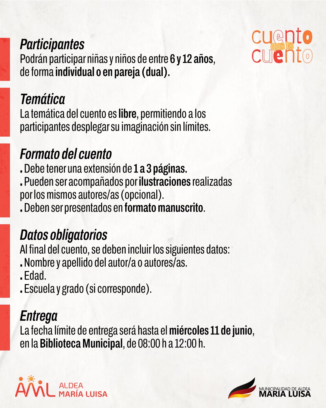 La Municipalidad de Aldea María Luisa invita a niñas y niños a participar de una propuesta no competitiva denominada «Cuento que te Cuento: Convocatoria para pequeños escritores».