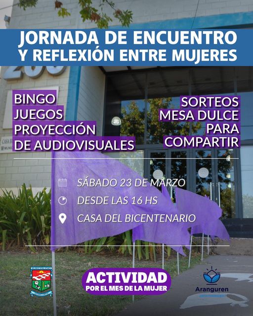 El Municipio confirmó una Jornada de encuentro y reflexión entre mujeres. Será este sábado 23 de marzo a partir de las 16.00 en la Casa del Bicentenario. Se incluirán estas actividades: bingo, juegos, proyección de audiovisuales, sorteos y una mesa dulce para compartir entre todas.