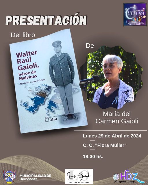 En el mismo lugar el lunes 29 de abril a las 19.30 se presentará el libro ‘Walter Raúl Gaioli, héroe de Malvinas’, autoría de María del Carmen Gaioli.