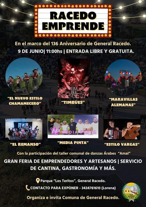 En el marco de los festejos por los 136 años de General Racedo, la Comuna anunció para el domingo 9 de junio a partir de las 11.00, en el Parque Los Teritos, con entrada libre y gratuita, la propuesta denominada ‘Racedo emprende’.