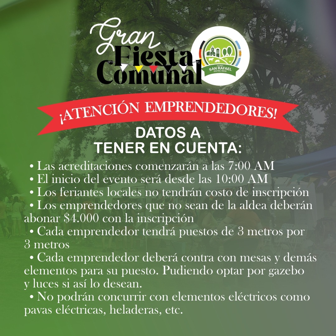 El domingo 10 de septiembre en la plaza principal de la aldea, desde las 10:00, se llevará a cabo la Gran Fiesta Comunal de San Rafael. Actuarán: Maravillas Alemanas, Ariel Cuello, La Clavija y Los Príncipes