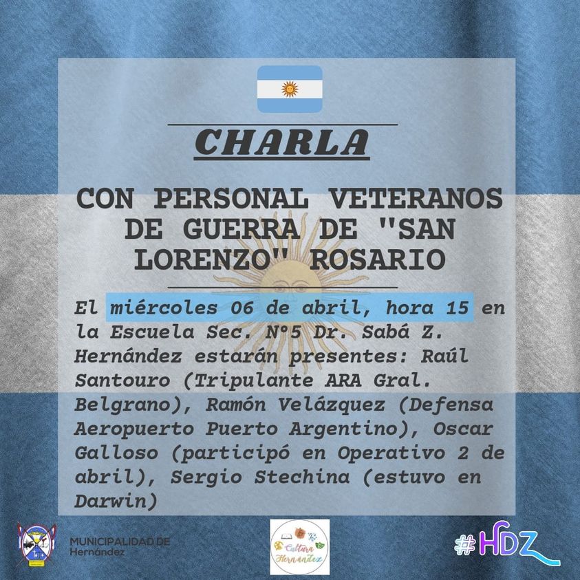 El miércoles 6 de abril a las 15.00 en la Escuela Nº 5 Dr. Sabá Z. Hernández se llevará a cabo una charla con ex combatientes de Malvinas. Estarán Raúl Santouro (tripulante del ARA General Belgrano); Ramón Velázquez (Defensa del Aeropuerto Puerto Argentino); Oscar Galloso (participó del operativo el 2 de abril) y Sergio Stechina (estuvo en Darwin).
