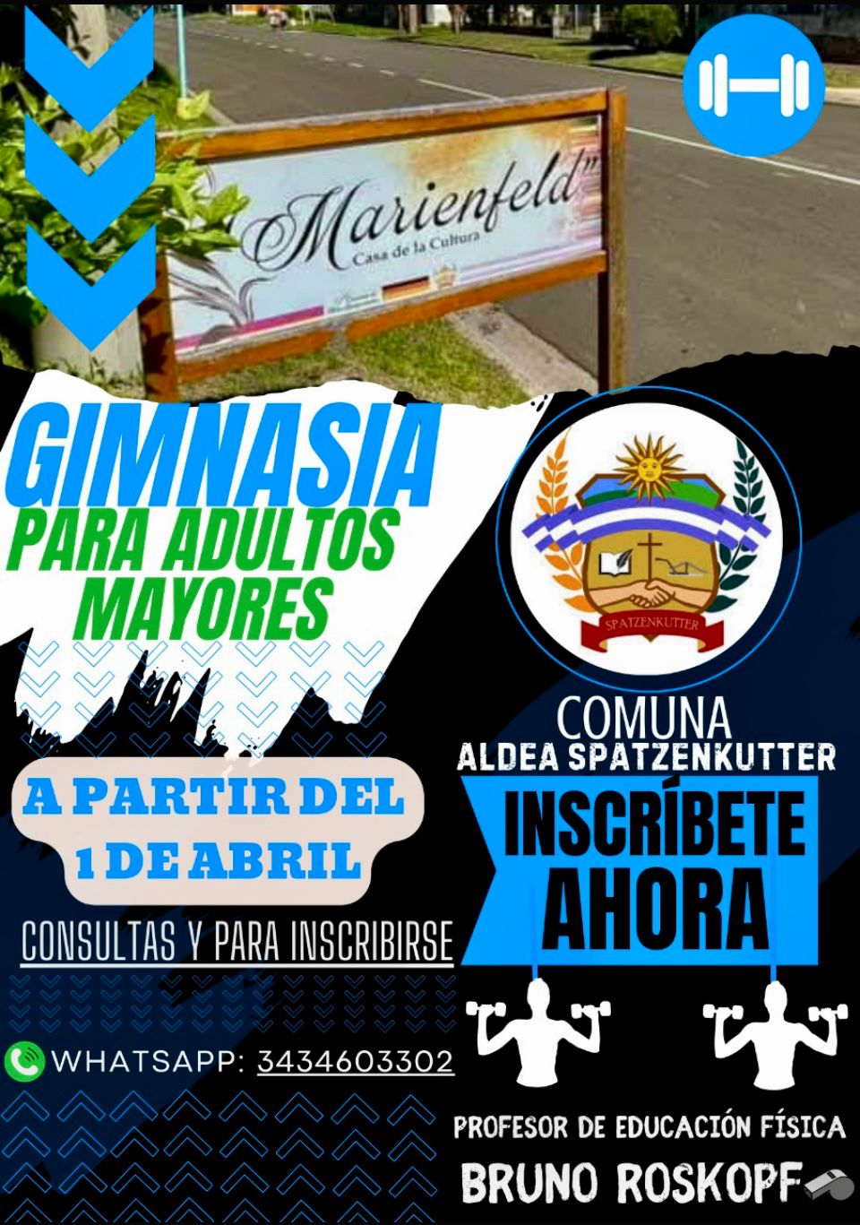 La Comuna de Aldea Spatzenkutter invita a quienes quieran ser parte del Taller de Gimnasia para Adultos Mayores -que se iniciará el 1 de abril, en la Casa de la Cultura Marienfeld y a cargo del Prof. Bruno Roskopf- a anotarse. Interesados en inscribirse o pedir más información pueden comunicarse al celular 3434603302.