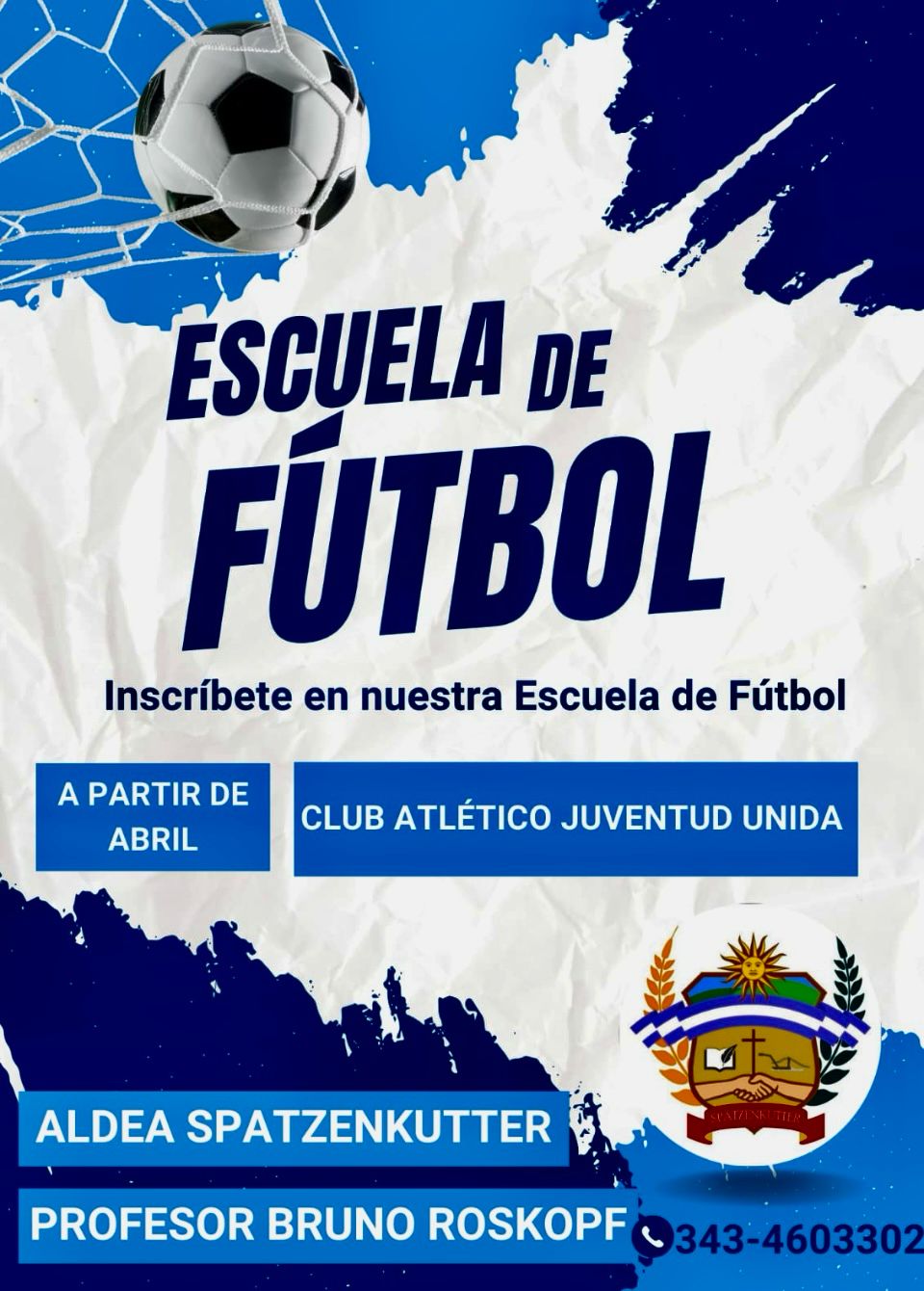 Por otro lado, invitan a inscribirse en la Escuela de Fútbol, también a cargo de Roskopf. Los entrenamientos comenzarán en abril, en el Club Atlético Juventud Unida. Interesados en inscribirse o pedir más información pueden comunicarse al mismo teléfono.