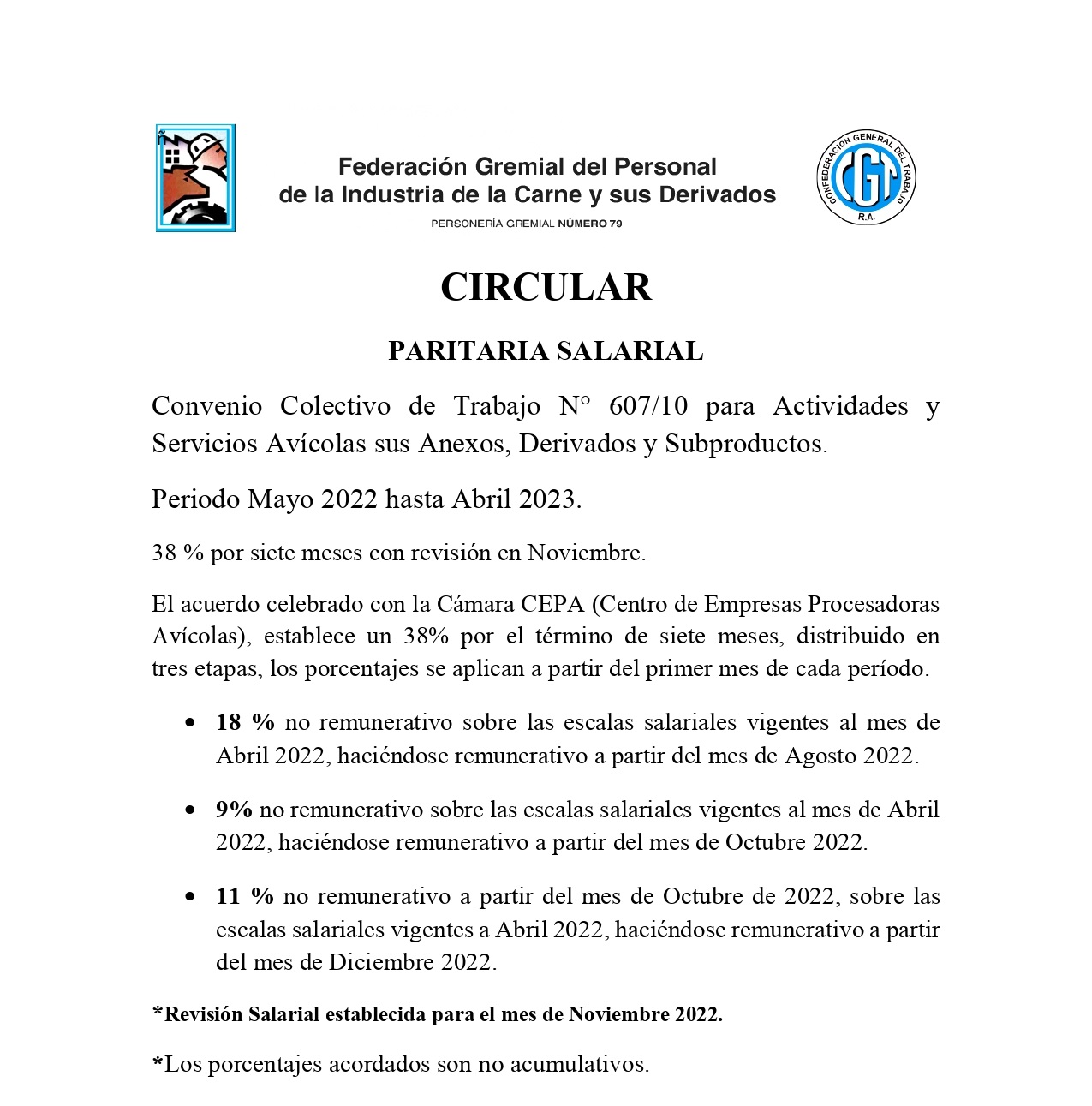 La Federación Gremial del Personal de la Industria de la Carne y sus Derivados anunció el martes 10 de mayo el acuerdo Salarial celebrado con la Cámara CEPA (Centro Empresas Procesadoras Avícolas). Establece un 38% por el término de siete meses, con revisión en noviembre.
