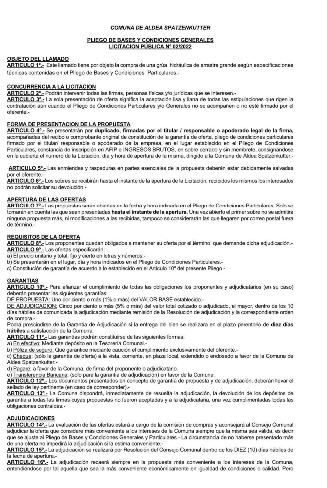 Desde la Comuna de Aldea Spatzenkutter dieron a conocer el llamado a Licitación Pública Nº 02/2022 para la compra de una grúa hidráulica de arrastre grande, multiuso, con comando y canasto, completa, con prolongador de hasta 12 metros como mínimo, patas de fijación preferentemente hidráulicas, control inalámbrico y canasto telescópico para operario con comando, con cubiertas nuevas colocadas, lista para usar.