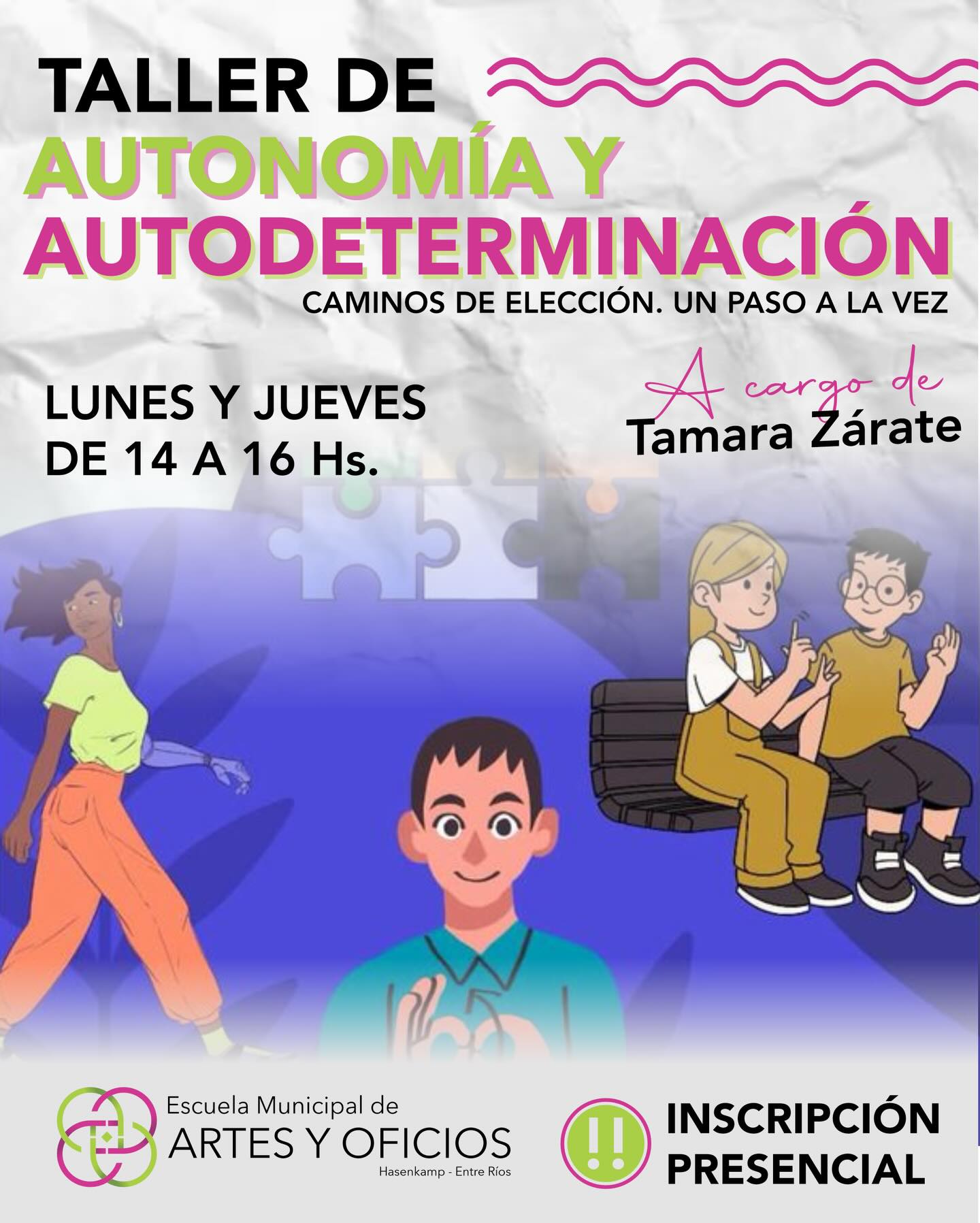 El taller comenzará el martes 14 de abril, lo dictará la profesora Tamara Zárate, y se desarrollará todos los martes y jueves de 14:00 a 16:00 en la Escuela Municipal de Artes y Oficios.