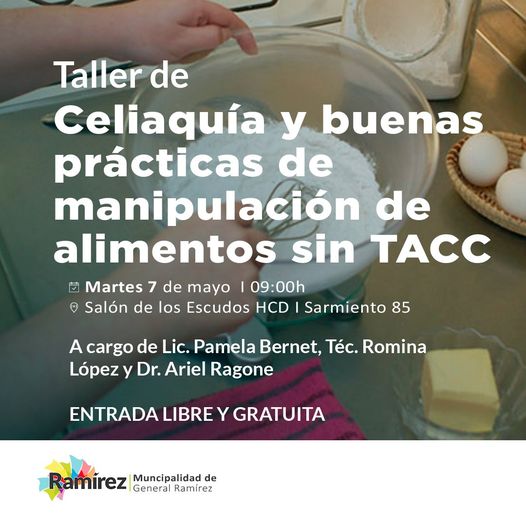 ¿Sabés cómo preparar alimentos aptos para celíacos? El Municipio invita al Taller de celiaquía y buenas prácticas de manipulación de alimentos sin TACC, que se llevará a cabo el martes 7 de mayo a las 9:00 en el salón del Honorable Concejo Deliberante.