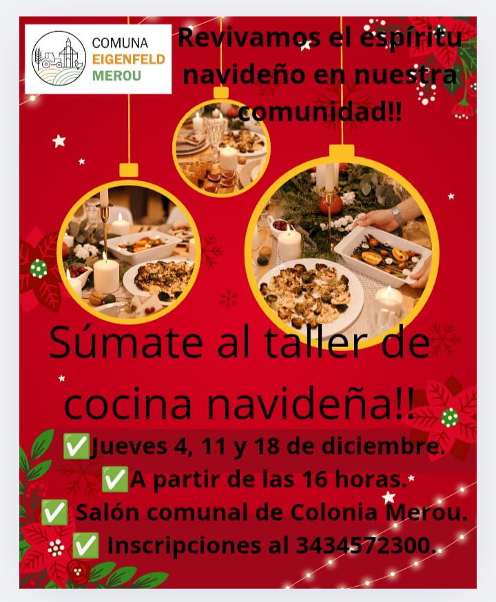 - Cocina navideña: jueves 4, 11 y 18 de diciembre a partir de las 16.00, en el Salón Comunal de Colonia Merou. Inscripciones al 3434572300.