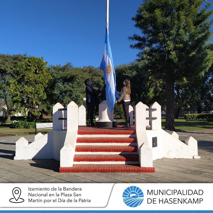 Con motivo de conmemorar un nuevo aniversario de la Revolución de Mayo, y en cumplimiento de los nuevos protocolos sanitarios, el Intendente de Hasenkamp Hernán Kisser y la Viceintendente Josefina Leiva Chaves izaron la Bandera Nacional del mástil central de la Plaza San Martín.