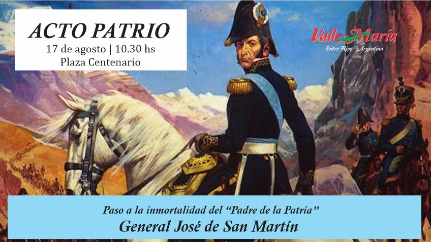 El jueves 17 de agosto se realizará el acto patrio, conmemorando un nuevo aniversario del Paso a la Inmortalidad del General José de San Martín. Será en Plaza Centenario desde las 10.30.